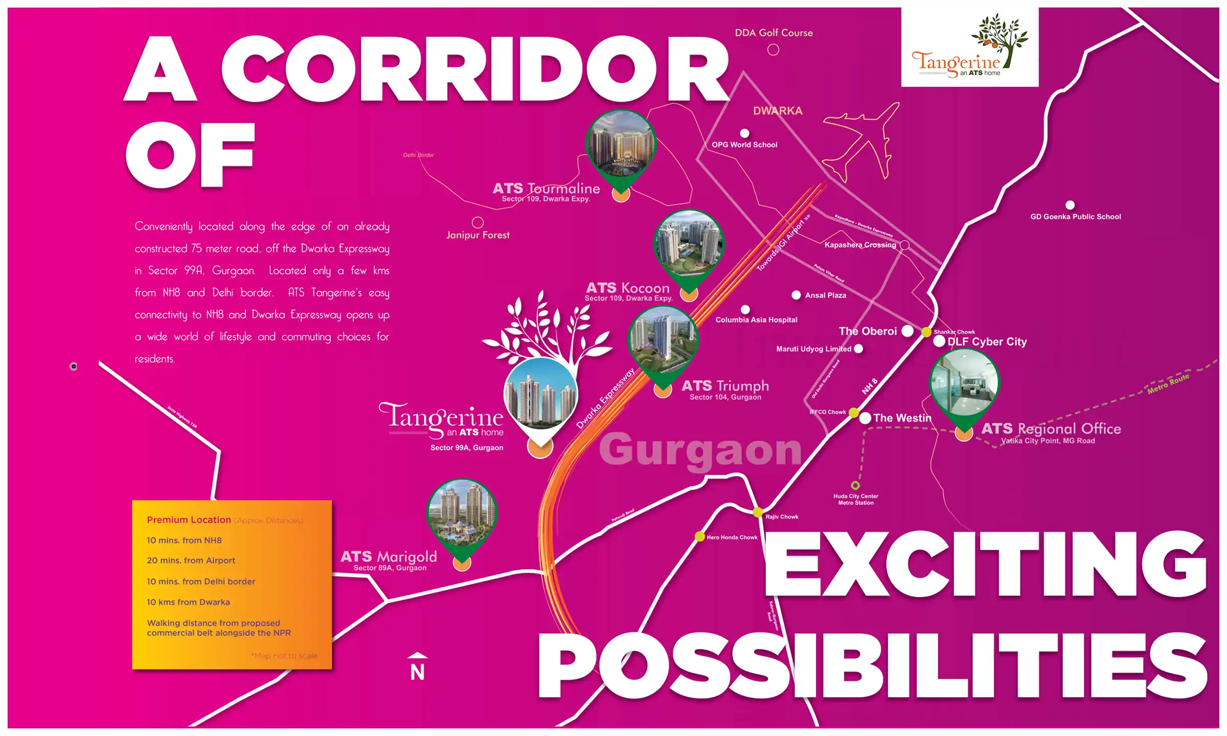 Being located in sector—99A Gurgaon, this ATS Tangerine project is located in a highly secure and favorable residential zone in the city. The project site is full of greenery and safe to live in with family. Moreover, the project location is easy to approach via road and gives easy connectivity to the highways, expressways, nearest airport, Delhi, Noida, Faridabad, and Greater Noida as well. Furthermore, the buyers will be pleased to the project spot close to the shopping malls, multiplexes, commercial shops, bus stands, local transport, metro stations, hospitals, banks, etc. Hence, this project is based at the perfect spot in Gurgaon which is good enough to live with dear ones.