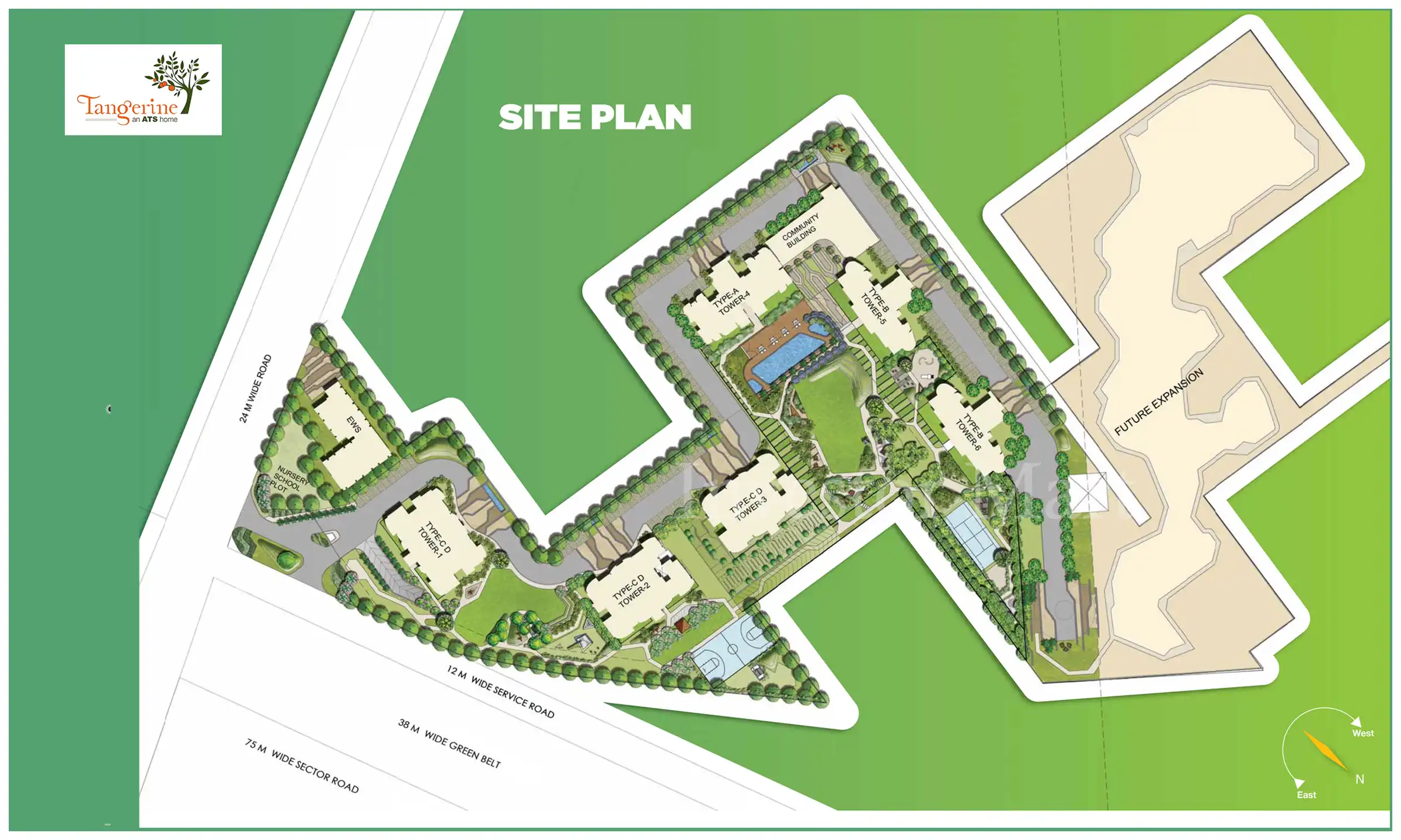 ATS Tangerine is a good investment project for home seekers. Moreover, this project attracts buyers through its useful amenities such as a swimming pool, gym, car parking, garden, playground, water supply, power backup, badminton court, jogging track, cricket ground, tennis court, security, CCTV, and more. Some more features available at the project site are banquet halls, party spaces, garbage collectors, rain harvesting system, drainage system, water treatment system, and more. Hence, this project of ATS has many attractions that will inspire buyers to get the apartments in this project.