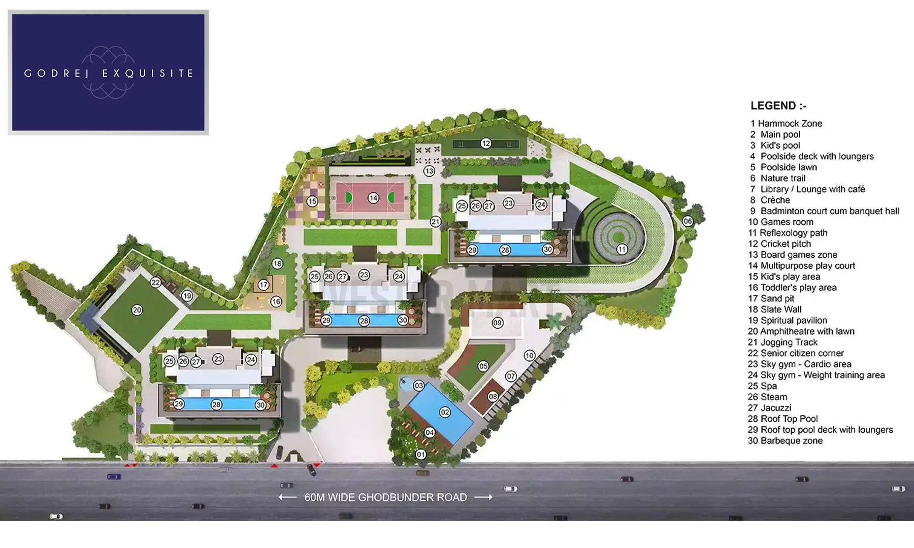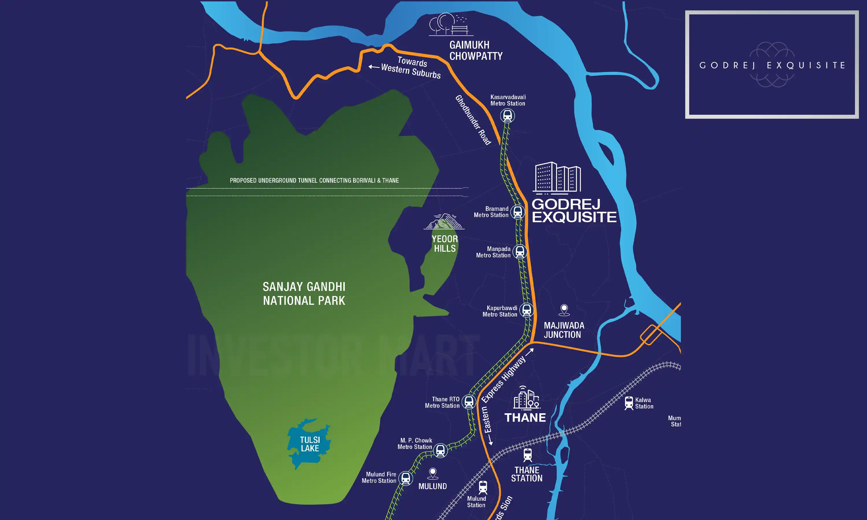 Godrej Exquisite is located at Thane around the main stretch of Ghodbunder Road. It gives the exclusive glimpse of Yeoor Hills and Sanjay Gandhi National Park. Godrej exquisite provides easy access through Mumbai-Thane Railway line and also Mumbai Thane Metro is on the verge of completion. Also, with arterial roads and the expressway connects it with all the better part of the city. It is located at most premium area of Thane near malls, schools and hospitals. It is also near to Thane station and has major transit routes along with proposed corporate campuses. It is also connected with consecutive flyovers along with major infrastructural developments that has made this route a place of gigantic proportions.