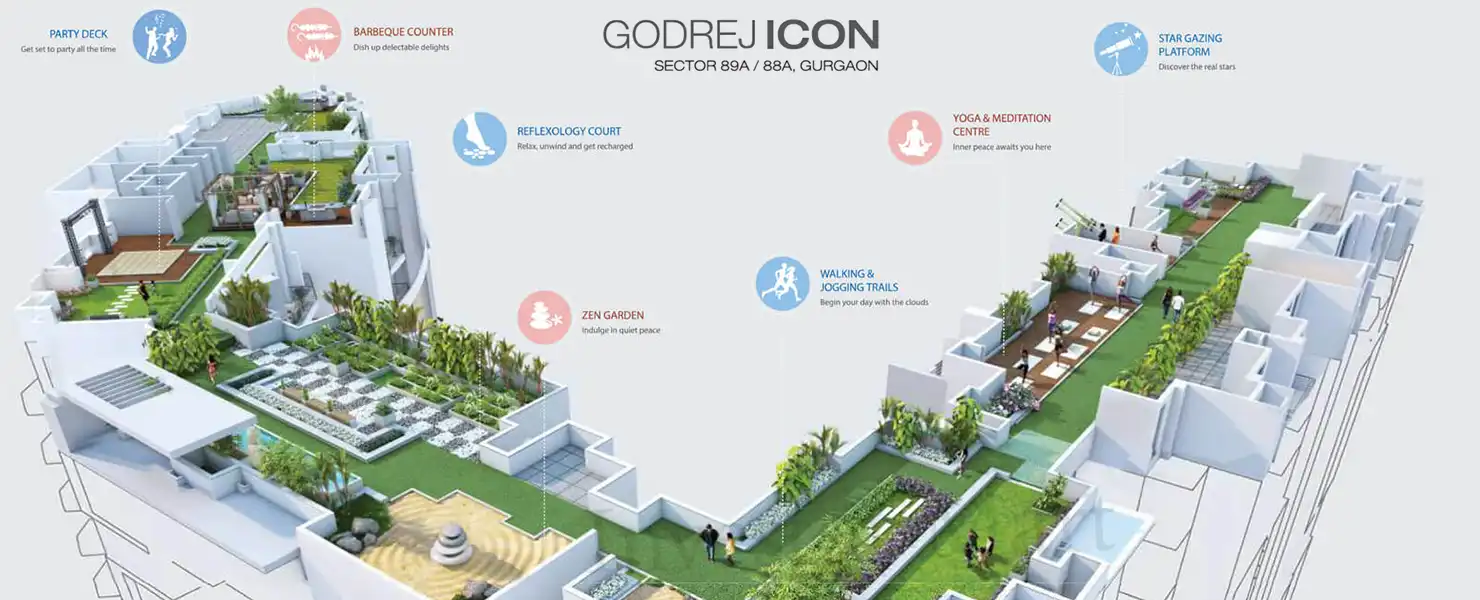 Godrej Icon is a residential project at Gurugram Sector 88A Northern Peripheral road Dwarka Expressway. It adds with luxurious amenities and specifications. The project is design for the people to enjoy luxurious lifestyle and has 2, 3 and 4 BHK apartments. It comes with floor sizes that ranges from 1490 sq ft to 3008 sq ft. The project comes with 32 storey tall iconic tower and has some of the latest features. It has Skywalk with Helipad, 17000 sq ft club area. The project has the latest necessity as car charging facility. It is within proximity to cities tallest towers. There is sky terrace and garden for the residents. The project adds with landscape and organic gardens within the vicinity. It comes up with an excellent connectivity that fulfils the aspirations of the residents.