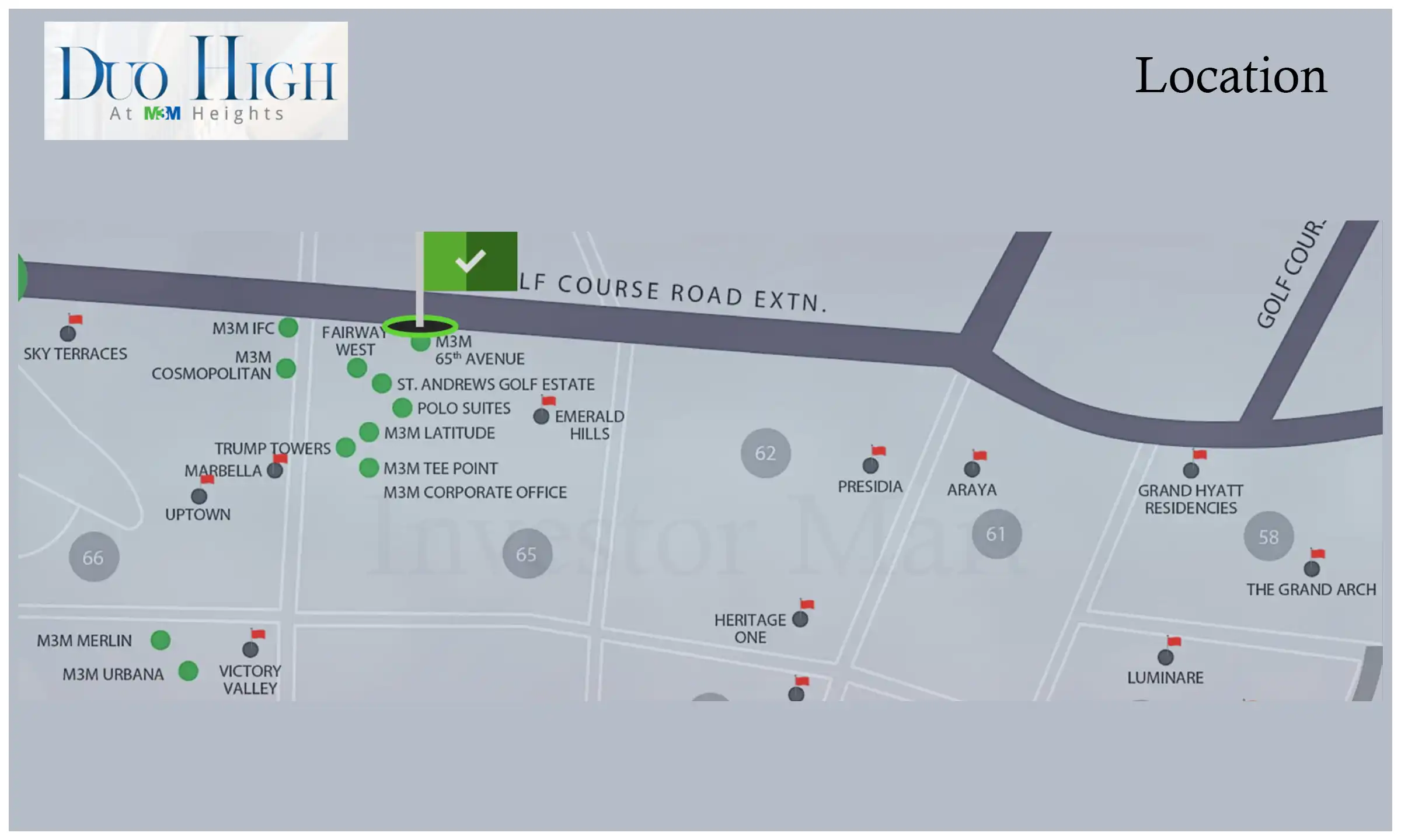 M3M Duo High comes with best of the specifications. It has 2 BHK + 2T with size of 1261 sq ft and price of Rs 1.15 Crore. It has 2 BHK + 2T + Study with size of 1433 sq ft and price of Rs 1.30 Crore onwards. It has best of the location advantage with Sector 65, Golf Course Extension Road. It is 30 minutes from IGI Airport. It has prominent schools like G.D. Goenka and Scottish High school. The nearby hospitals like Max, Fortis that gives superior medical facilities.
