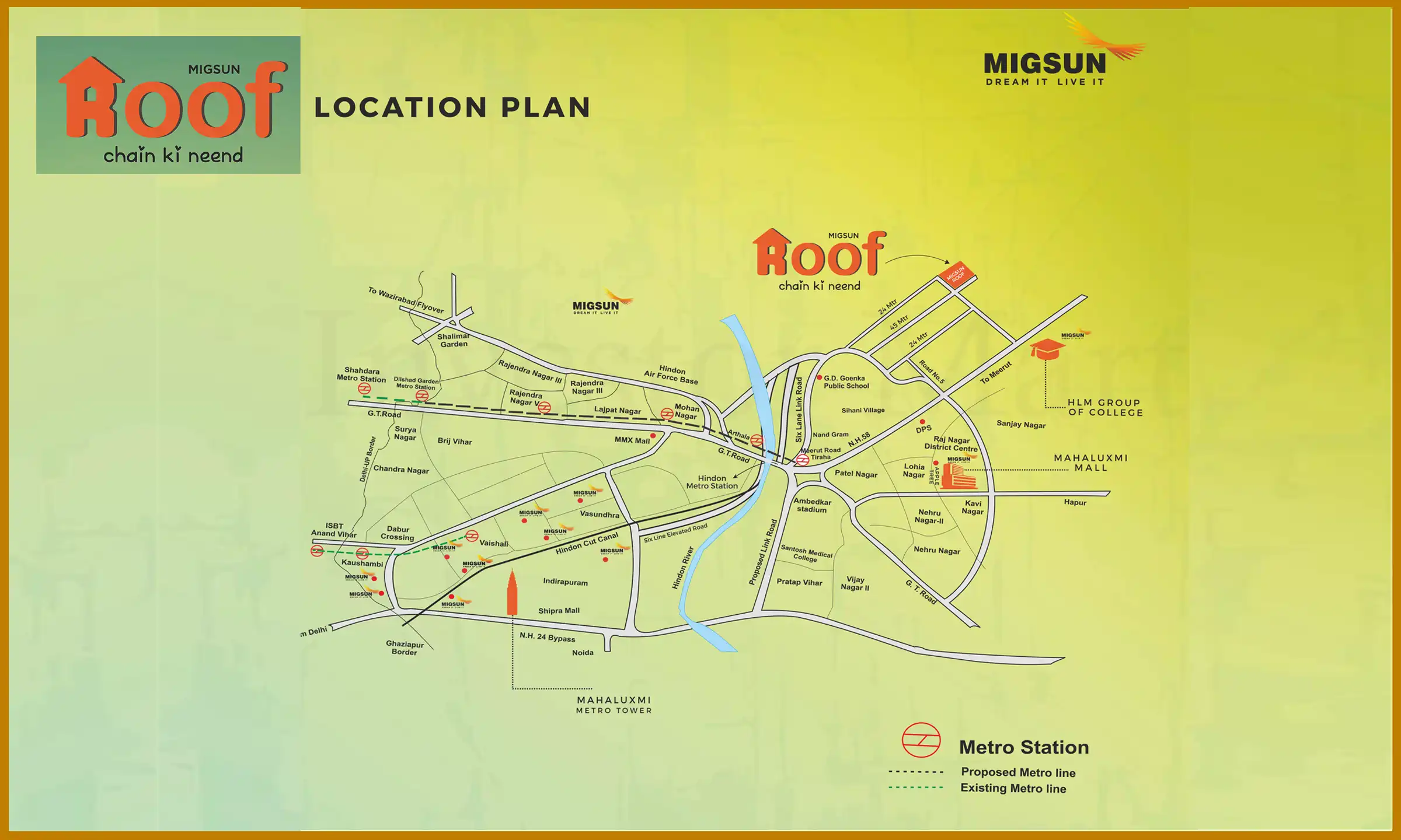 Migsun Roof is based at a prime location in Raj Nagar, Extension that is suitable for living with family, as it gives proximity to benefits like schools, colleges, banks, malls, hospitals, shops, etc. Besides, the site is also connected to highways like NH-24, NH-58 Bypass Road, Ghaziabad, railway stations, Jewar airport, etc. Hence, the location of the project is perfect to live with dear ones.
