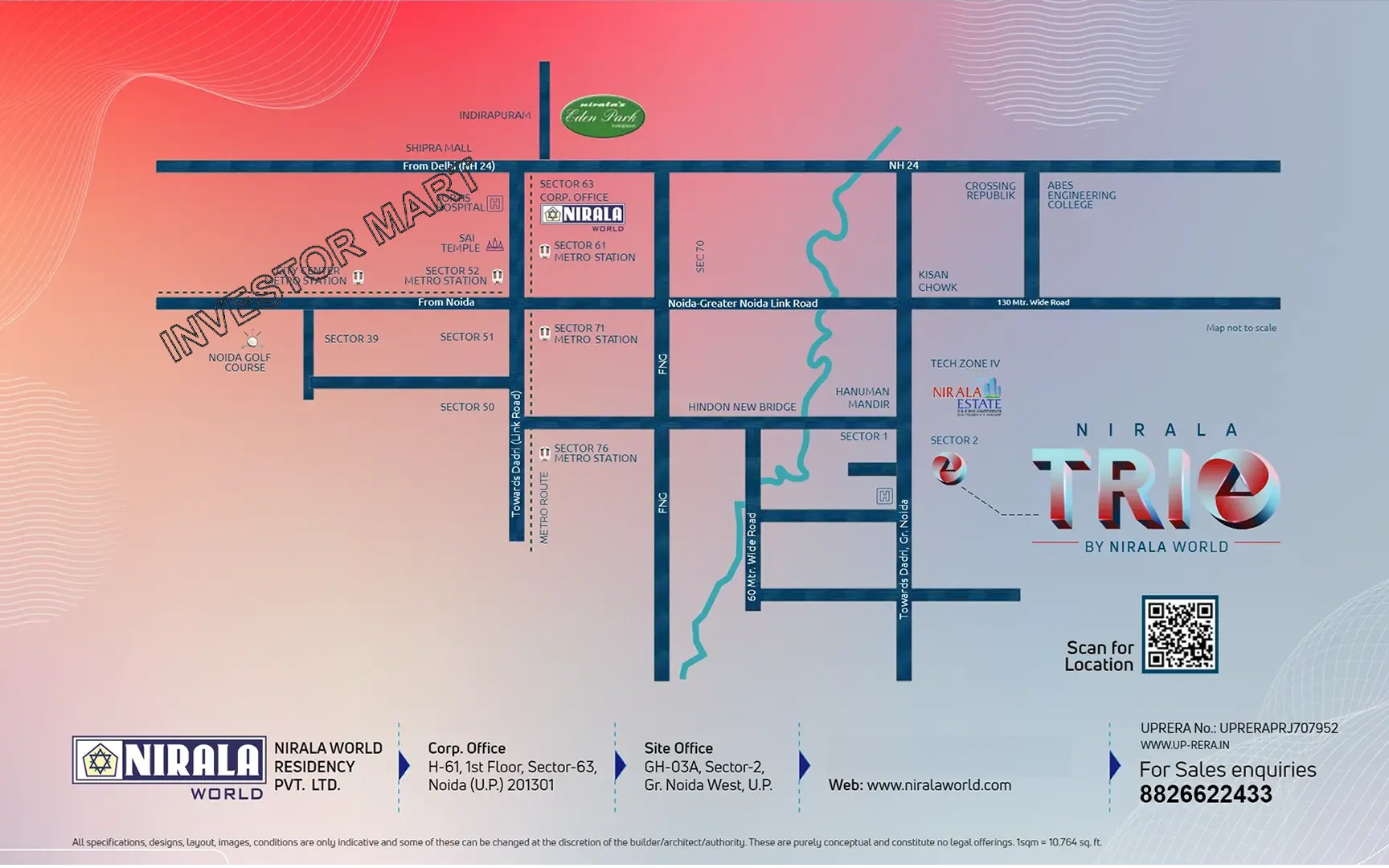 Nirala Trio is residential project with best of connectivity options. With Noida Extension that gets more of importance these days as Jewar International airport is within easy reach. The project develops more of a better community living with best of the infrastructure within proximity. The residential development is easy to buy and has best of the schools near to the complex. It has some of the best known schools and universities that includes Galgotias University within near to the project. The metro connectivity is on offer and the highways like Noida-Greater Noida Expressway and Yamuna Expressway are within few kilometres from the project.