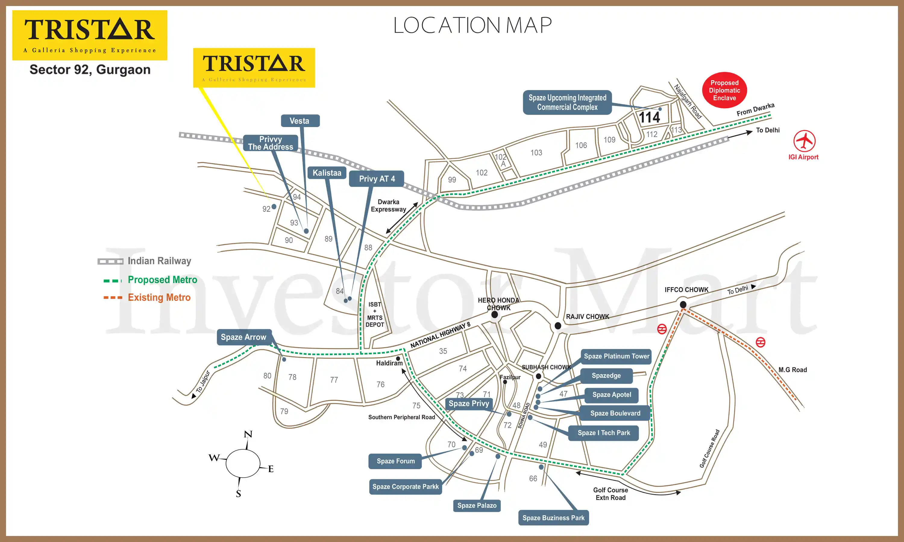 Spaze Tristaar is a residential project which fulfils the needs and aspirations of the people from Gurugram and Delhi NCR. The project development comes with latest offering in commercial and retail with retail and anchor shops. It has 5 screen multiplex with an area of 2.75 acres and adjacent to 70 acres of residential townships. It assures huge number of footfall and thus makes it one of the most develop project with assure returns. The project has good number of well integrated open air bazaars that is triangular in shape. It creates maximum visibility and connects with multi utility corridor that connects towards Dwarka and Manesar.