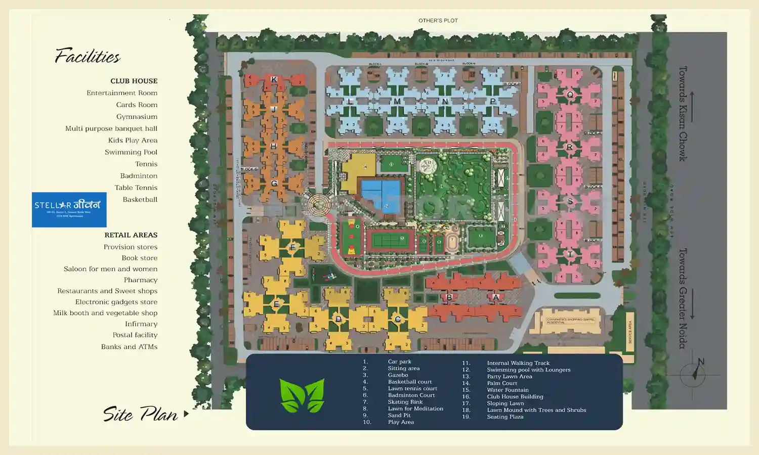 Stellar Jeevan has some fascinating amenities that make it an ideal project to invest in. Those amenities are a garden, playground, swimming pool, water supply, power backup, tennis court, badminton court, jogging court, CCTV, etc. Moreover, the project site has other facilities such as a rain harvesting system, garbage collector, water treatment system, cricket ground, banquet hall, car parking, and so on. Hence, this project has so many things for the families that will give them comfort to live to happily.