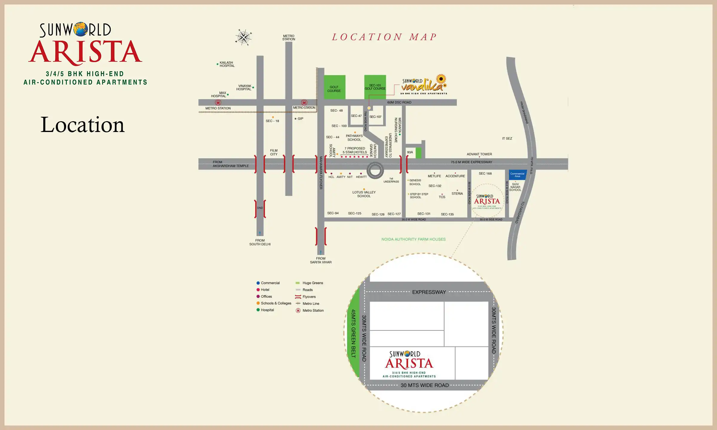 Location: Being located in sector-168, Noida, this Sunworld Arista is based at a prime location in the city, which is suitable for living with family. This project is also convenient to reach via road and gives access to facilities like malls, shops, banks, hospitals, schools, colleges, etc. Besides, this project site is also connected to highways like NH-24, FNG Expressway, Maha Maya flyover, etc. Furthermore, the project site is in proximity to other facilities such as Ghaziabad railway stations, Jewar airport, DLF Mall, Golf course, and so on. Hence, the location of this housing society project is appealing to the buyers and enables them to find all relevant living benefits close to the site.