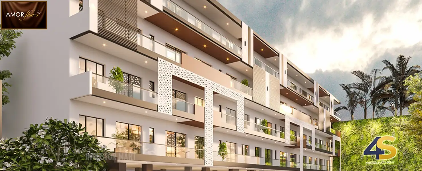 Apartments in 4S Amor Floors: The living and dining room of the property feature vitrified tiles, while the walls and ceiling are finished with acrylic emulsion paint. The master bedroom has Matt Ceramic Flooring and the balconies are painted with weather-proof paint and equipped with toughened glass railings. Bathrooms are fitted with Jaguar or equivalent CP fittings and chinaware. The kitchen is a premium modular kitchen with superior quality ceramic tiles and accessories such as a microwave, micro-oven, hob, and chimney. The parking area features granite or equivalent flooring, while the terrace garden has vitrified flooring. The main door is 32 mm thick and laminated, and matching hardware is used in the doors and windows.