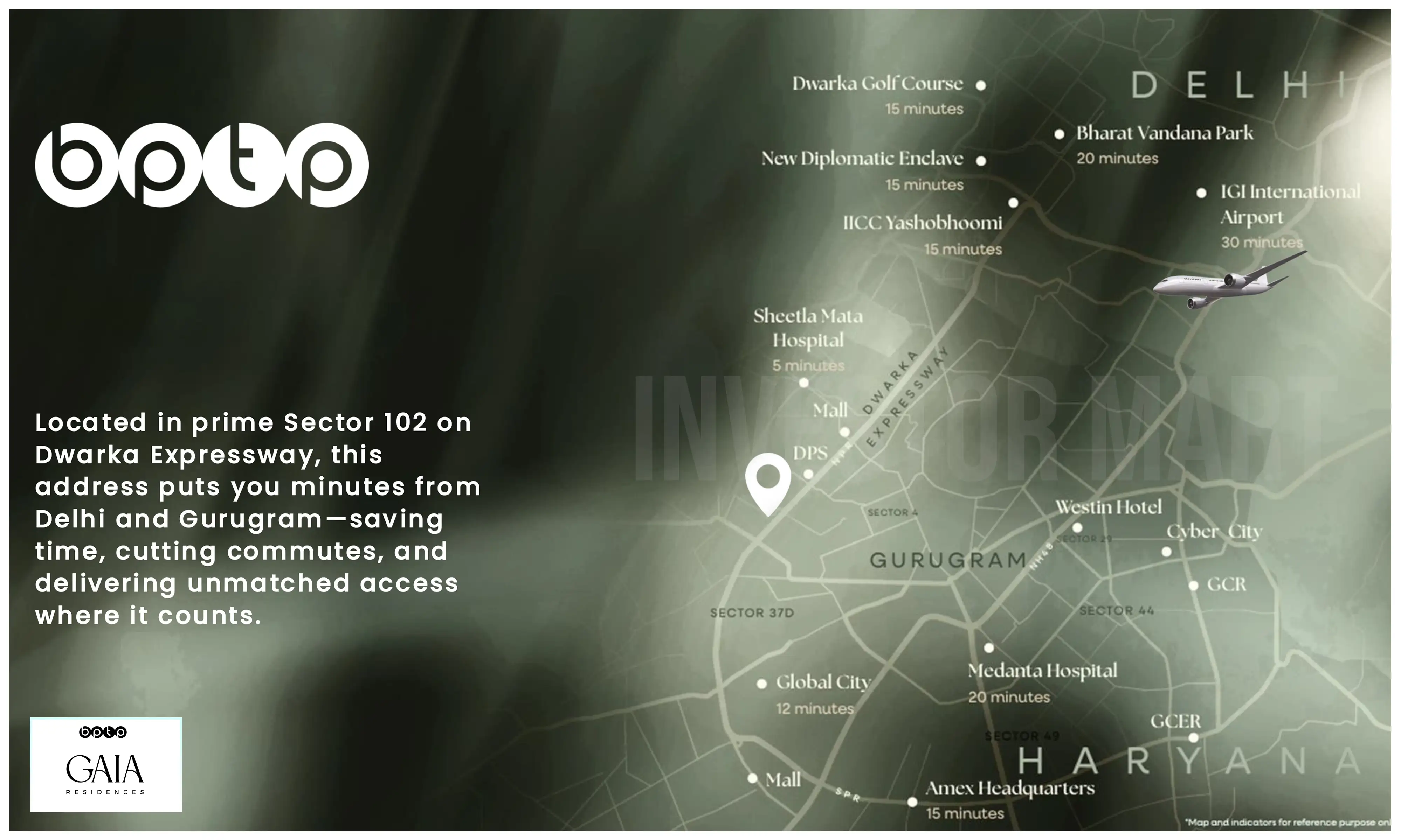 Overview BPTP Gaia Residences Homebuyers looking for furnished apartments under the budget in Gurgaon will find their new properties in BPTP Gaia Residences. This is a new housing project, launched in Sector 102, Gurugram, which is a premium site in the city to live with family. The project location is fantastic, as it is easy to approach from every corner in NCR via road. Also, the location is connected well with the nearby benefits like bus stands, metro stations, highways, and airport lines in NCR via road. Besides, the location of this is ideal to buy residential property, as it is close to the top facilities like hospitals, banks, malls, multiplexes, marketplaces, and more. Hence, this housing project is a good investment option for families to book properties for living with dear ones.