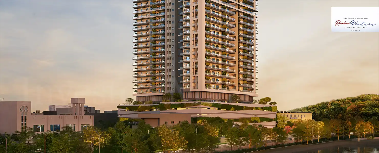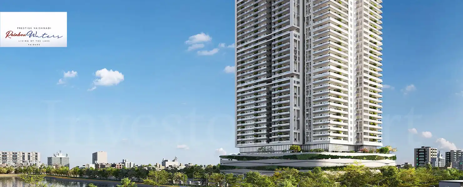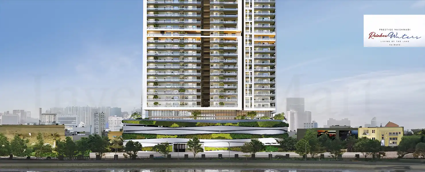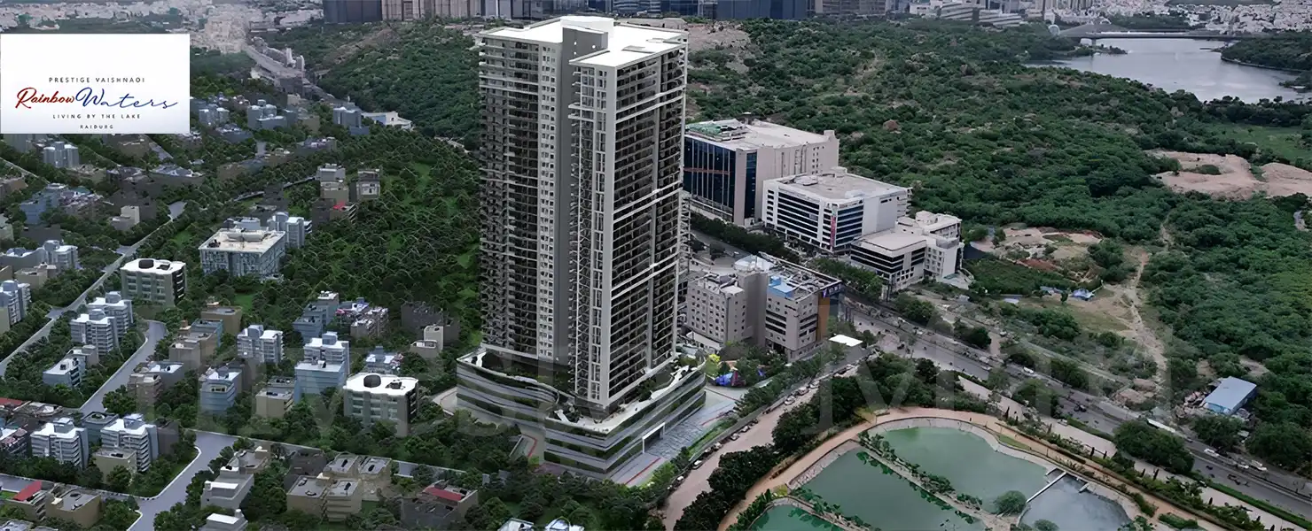 Overview Prestige Vaishnaoi Rainbow Waters The residential project offers premium-lake facing residential properties with 4 and 5 bhk luxurious apartments. The residential project gives you ideal lifestyle developments with a huge area of 2.43 acres. It is with premium lake-facing residential developments at the pristine location of Raidurgam, Gachibowli, Hyderabad. The project adds single well-developed high-rise towers along with double basements, with 5 levels of podium base developments. It adds 36 floors. The residential project offers 150 premium homes along with well-managed planned developments. It adds well-planned interiors and offers large balconies. The project adds high-rise luxurious floors as residential apartments with proximity to multiple project developments that are at the premium location of Raidurgam, Gachibowli, Hyderabad.