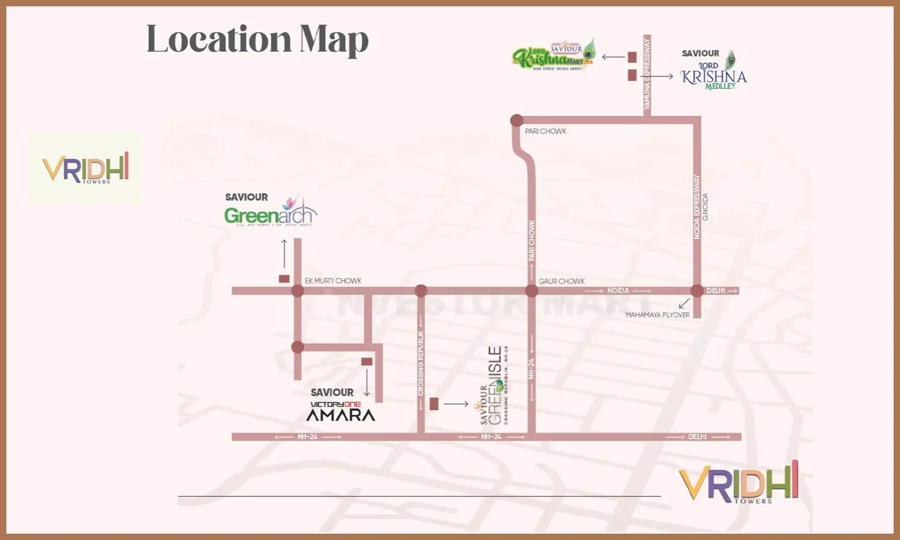 Location Advantages The location of Saviour Vridhi offers numerous advantages to its residents. It is in close proximity to metro stations, making daily commuting convenient and hassle-free. The project is also surrounded by banks, leading schools, colleges, and multi-specialty hospitals, providing easy access to essential amenities and services. Additionally, the presence of a 7.5-acre park adjacent to the project offers residents a serene and green environment to enjoy.