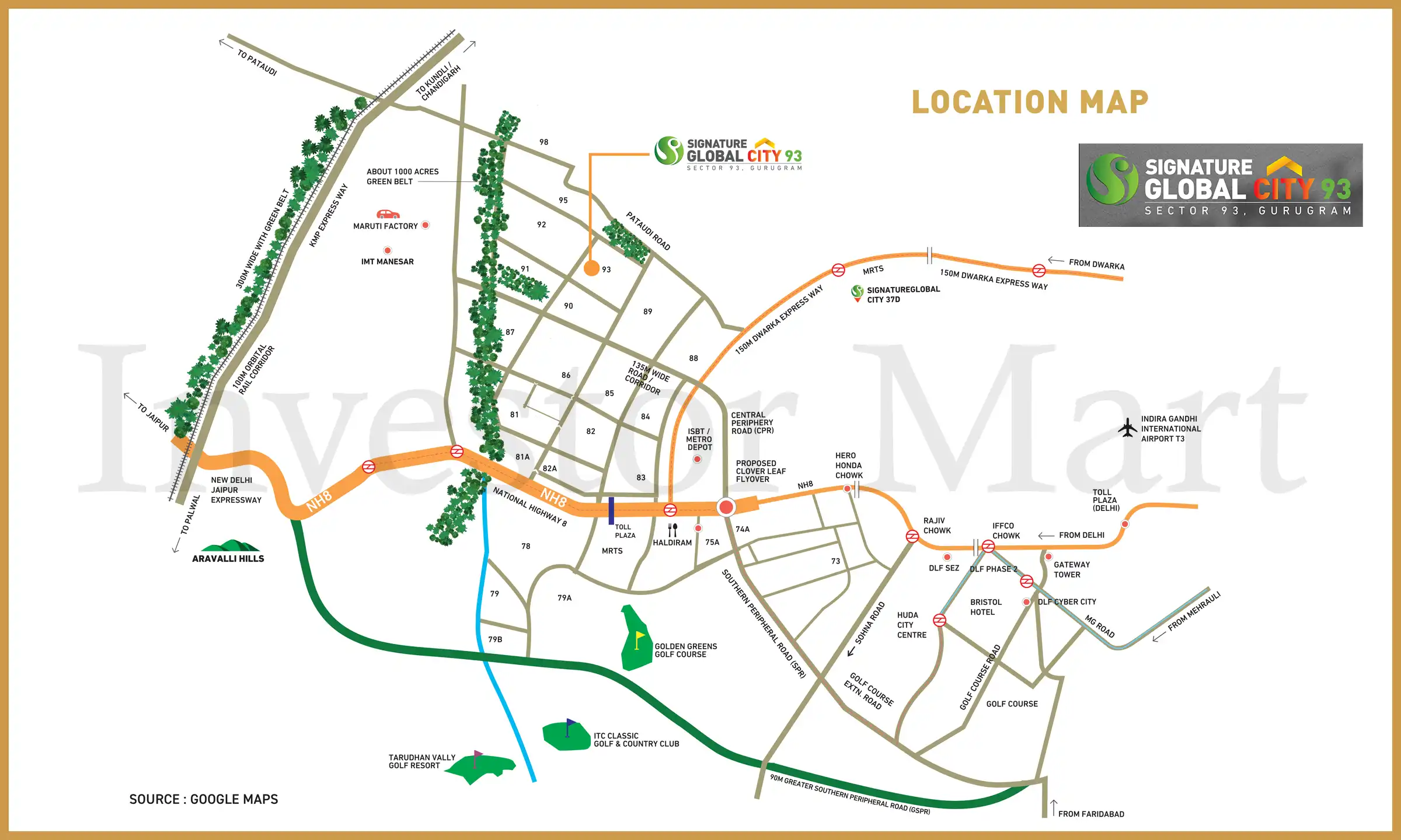 Location Location wise, this Signature Global City 93 is based in Sector 93, Gurgaon. The project site is lush, as it is blessed by the nature-rich elements like plants, trees, and lush surroundings as well. The project location is also ideal for living, as it is near essential benefits like bus stands, metro stations, hospitals, banks, schools, colleges, etc. Besides, you can get some other amenities close to the site like malls, multiplexes, shops, healthcare centres, and so on. Thus, the buyers will get all sorts of living facilities for families near this project site in Gurgaon.